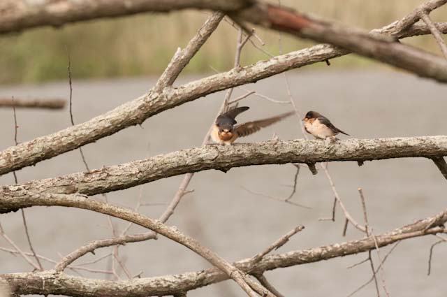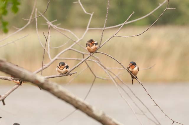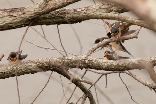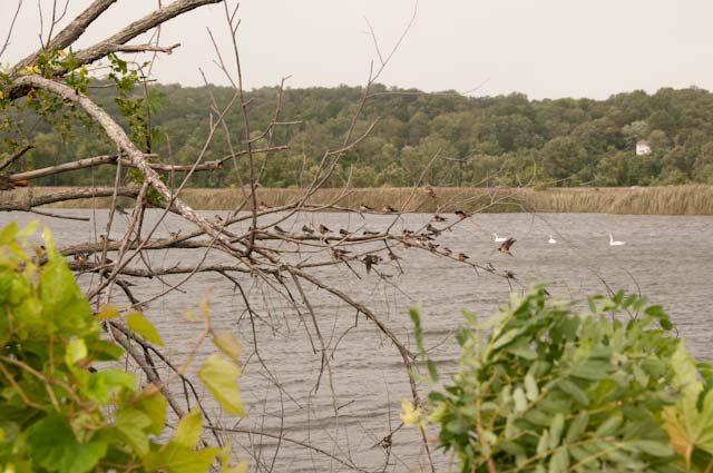 The backlash of Hurricane Irene arrived carrying very strong winds. I was hoping to see eagles soaring and enjoying the air above the Croton Train Station Boat Landing. The swallows along the Senasqua Bay part of the Croton Bay at the boat landing were hanging onto the trees as best they could. I have posted a series of pictures that shows how the birds coped. I believe there are several species of swallows trying to stay on the branches – tree and barn, plus another.