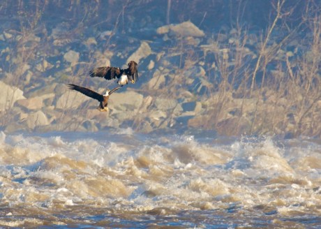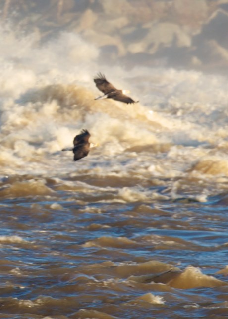 This was the view from way across the Conowingo Dam in Maryland on Thanksgiving weekend. Water gushed from the spillways and turbines at the dam and the eagles could not see the fish. What fish they could see were on the other side of the island in the middle of the Susquehanna. Someday someone will invent an xray camera that photographs through rocks.