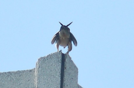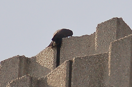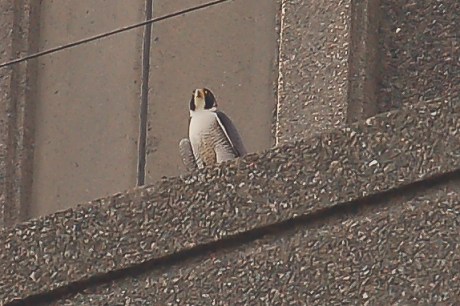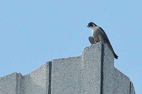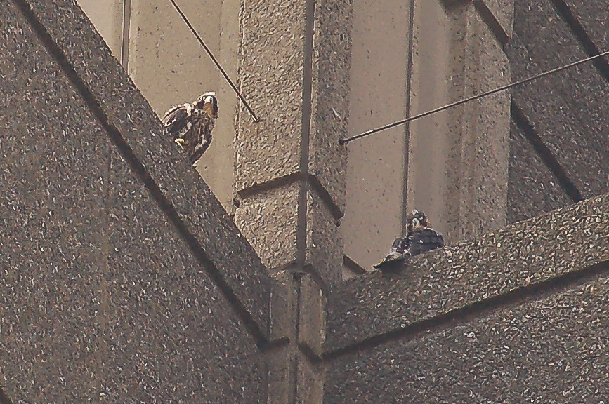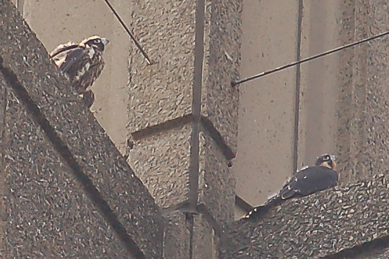 It is fledge time here in the NYC area. The gorgeous birds that call 101 Hudson in Jersey City their home are ready for the annual rite of passage. My friend, Mike, and I arrived at 8:30 am on a Sunday. We saw one of the eyases on the ledge opposite the nest box and the two adults up on the top parapets. The youngster was voraciously chowing down. Shortly afterward the second eyas, a BIG female, hopped up to the nest box ledge. Both birds were close together in the shady corner of the 40th floor and the down was flying. Suddenly the adults both took off at high speed to the west. Then a third falcon appeared on the top parapet in the middle of the north side of the building. The adults dive bombed something on the roof. At first we thought it might be the fifth peregrine in view, but it seemed they were going after something more in the middle of the roof. The fifth bird took off in a very wobbly flight to the west over the building, but we did not see it land. We are checking out whether or not we had the first fledge by one of the two males and someone in the building found the bird and returned it to the roof. No need to put a caption on the pictures. Pictures were taken two blocks away from the 7th floor of a parking garage.