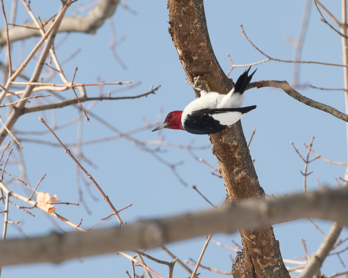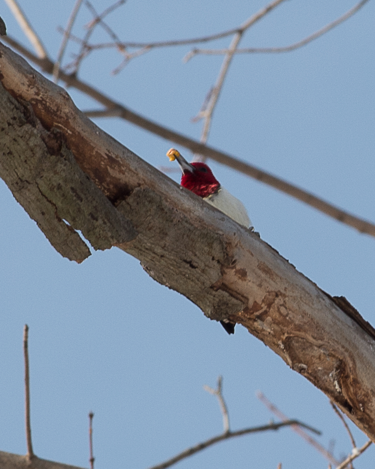 Got a text from Charlie and Karolyn that there were two red-headed woodpeckers at Kingsland Point Park. I was just over the MTA tracks in DeVries Park so I immediately took off. This happens to be the same woodpecker enjoying a few different meal courses in the park. It seems we have a red-headed woodpecker explosion here. We were all looking for a snowy owl close to home.