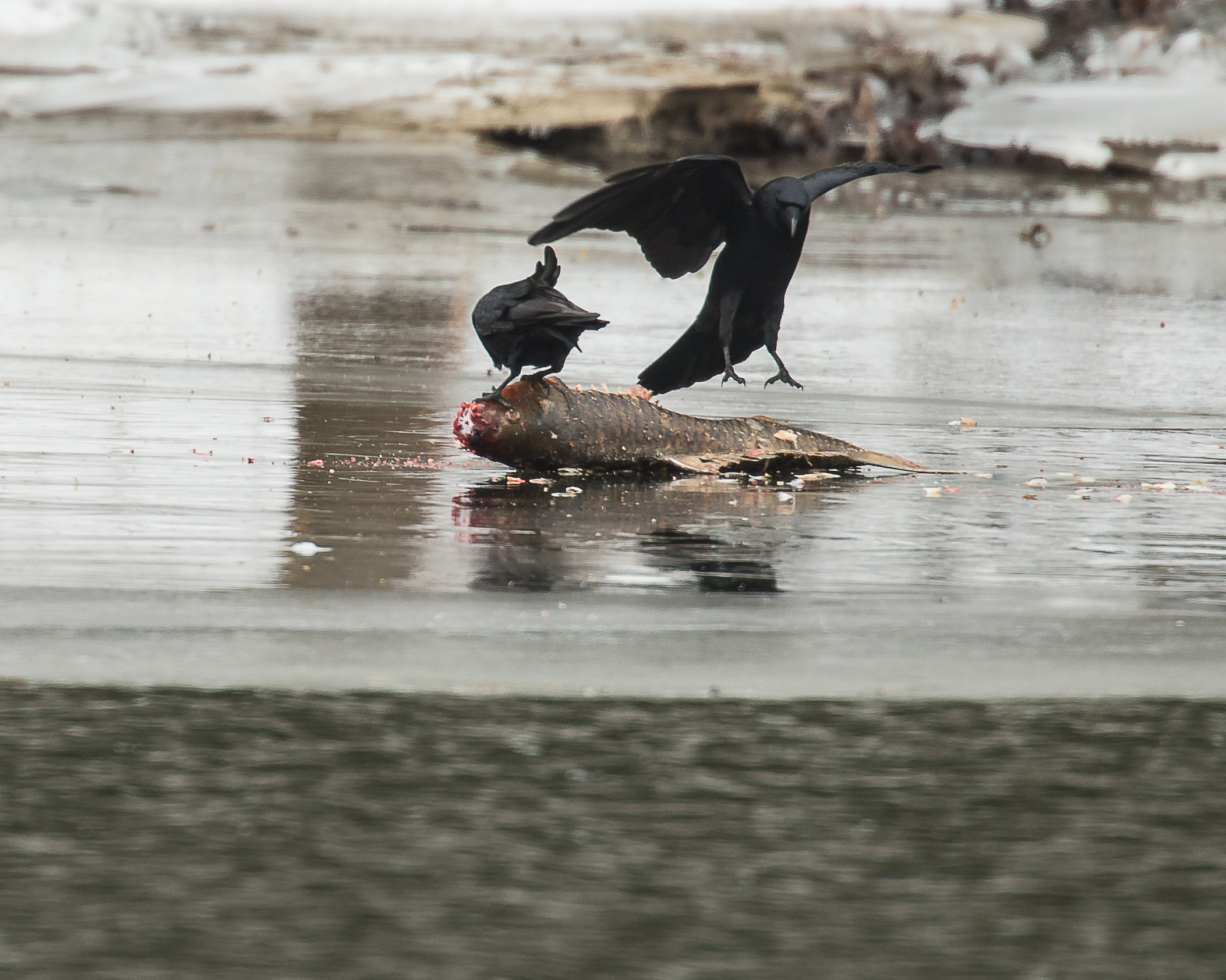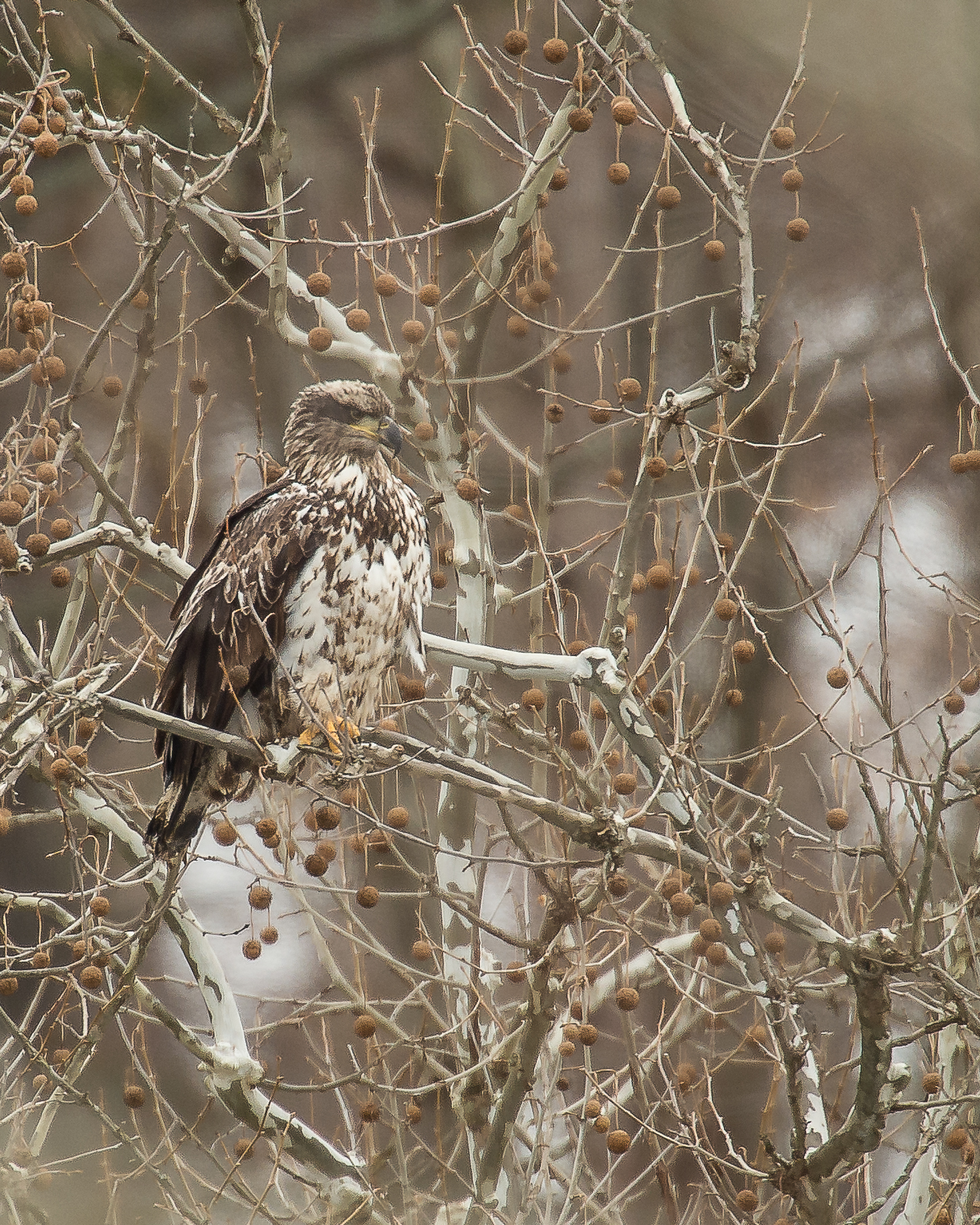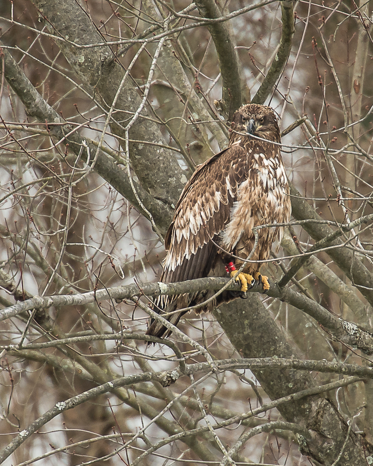 Eagle with bands enjoying fishing in the Viking Marina in Verplanck.Young eagle waiting for lunch on the Croton River.Second eagle waiting for lunch downstream from the first one on the Croton River.Eagle lunch for the crows. The young eagles were apparently nervous about eating their lunch.Robin at George’s Island. I can’t wait for spring, either. There were berries in the bush below this tree. A large flock of robins was enjoying a meal.