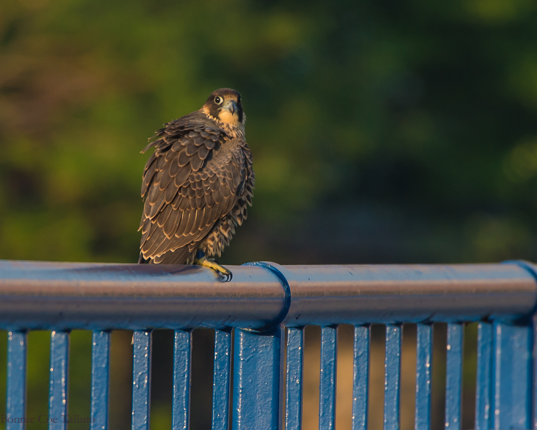 The falcon population in Rochester is growing. Here is Cadence, 2015 fledgling, who landed on the rail in front of us early Saturday morning. The Seneca Towers falcons are below.