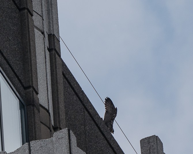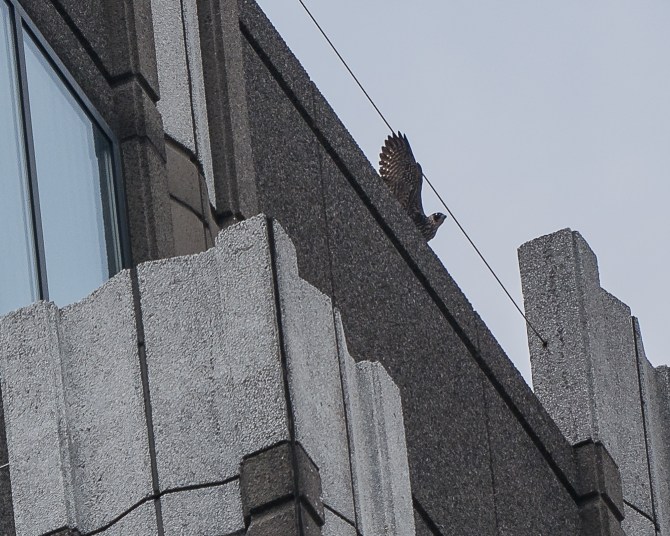 It won’t be long now before this big girl takes to the skies. She was flapping like crazy out of cam view on the west side of 101 Hudson. It looked to me like she would fly any minute. She is so big that if she keeps her wings out she will not fall hard if she goes down. In the past, the adults have flown on either side of a first time fledgling and provided draft to keep their offspring aloft. This girl is almost twice the size of the male, so I hope he is an excellent aerialist.