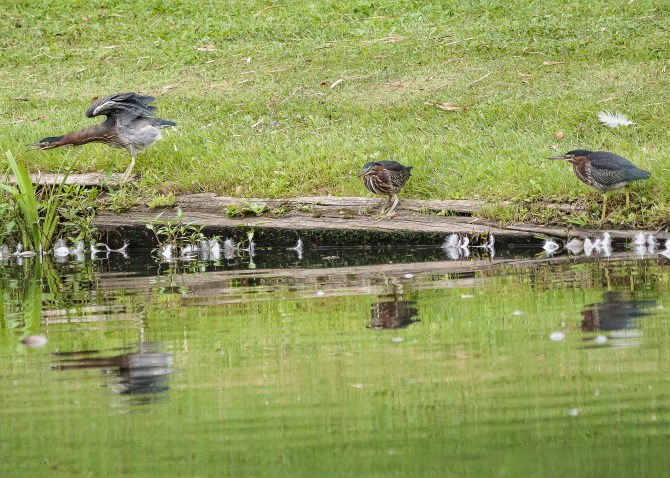 It’s all about the herons around here. The great blue heron fledglings have flown the coop and are now finding their way along the Hudson River or points east. These little green herons must have figured out that there is safety in numbers. The Canadian geese are thriving.
