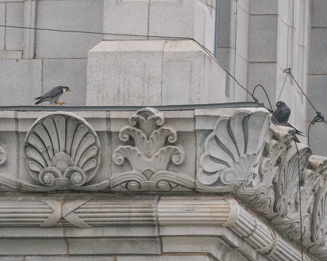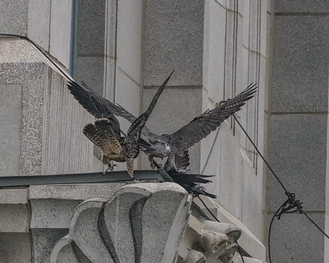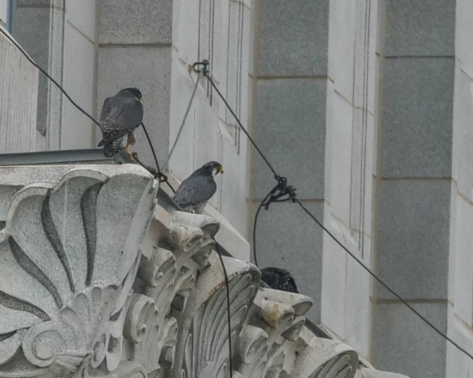 But, lo and behold! For sure a third juvie wanted to help me photograph the gang on the courthouse tower! He kept getting closer and closer to me. I definitely do not look like Kathy Clark, the NJ biologist who medicated and banded him. He definitely looked like he had just had a meal.
