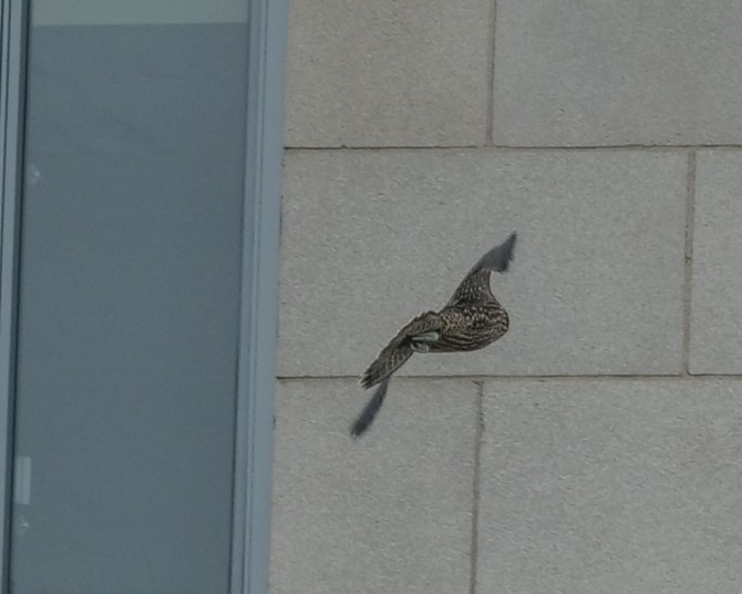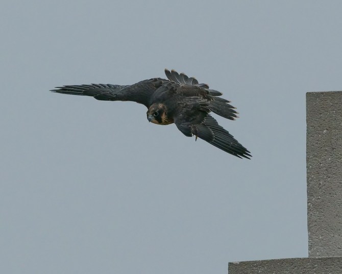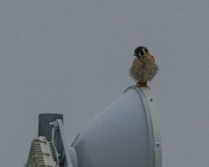 I heard more begging and thought I saw a third or fourth youngster on the satellite dish behind me. A kestrel was pretending to be a peregrine.