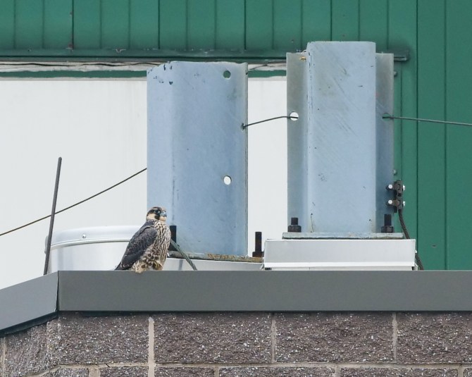 I started on the NW side of the tower where the igloo is located, but decided the garage roof would give me the best view. Yup! I spotted one of the young to the west on a building nearest the tower.
